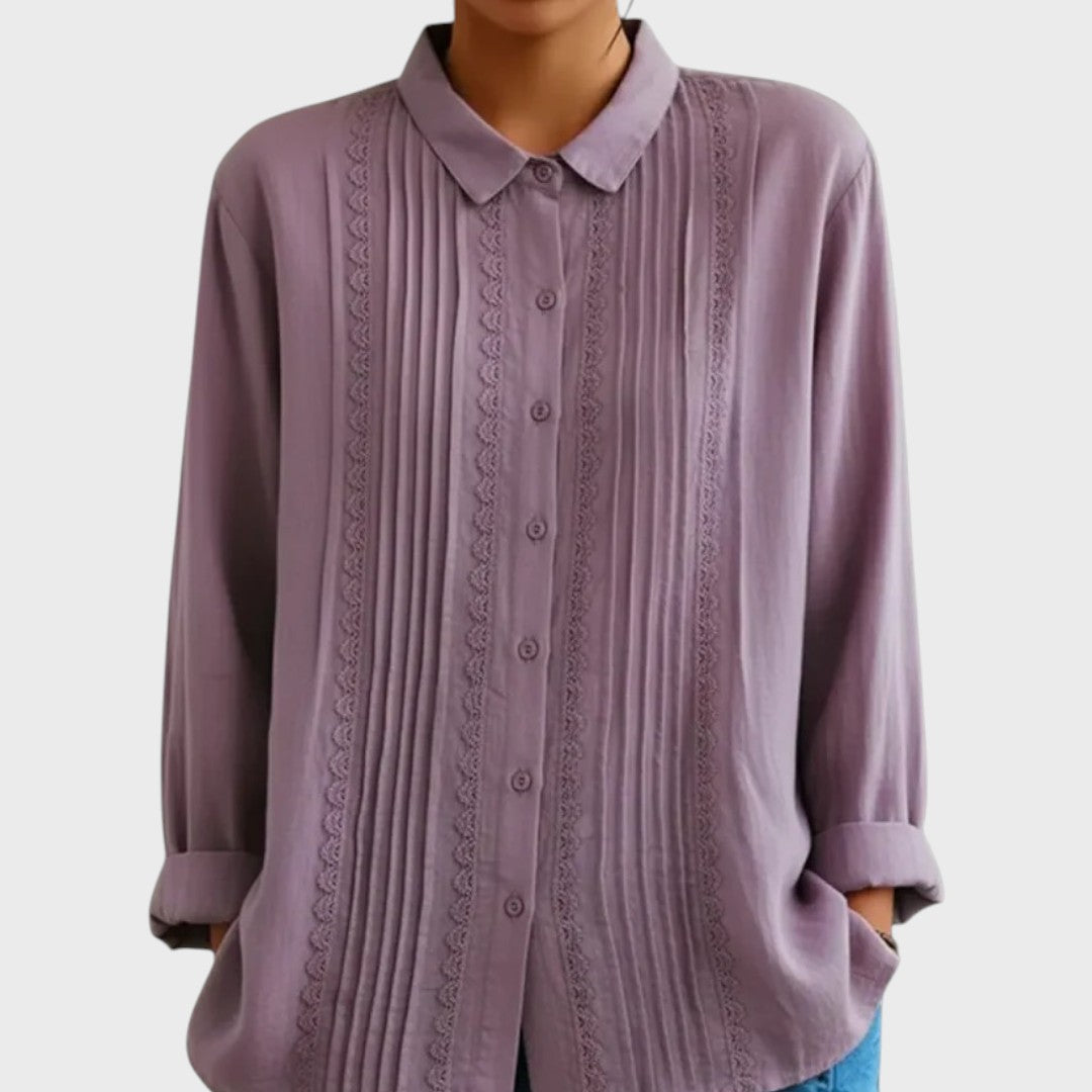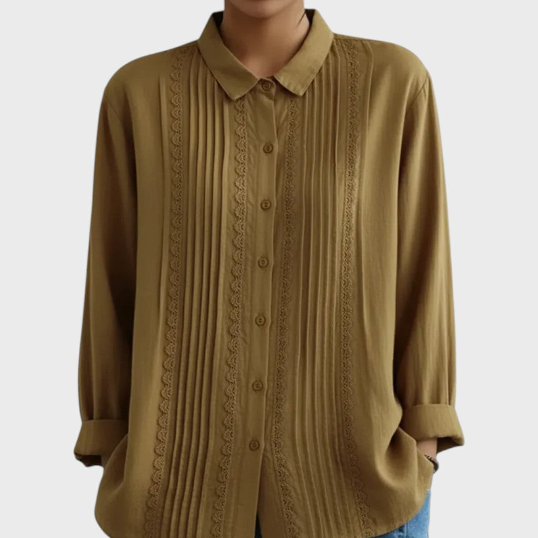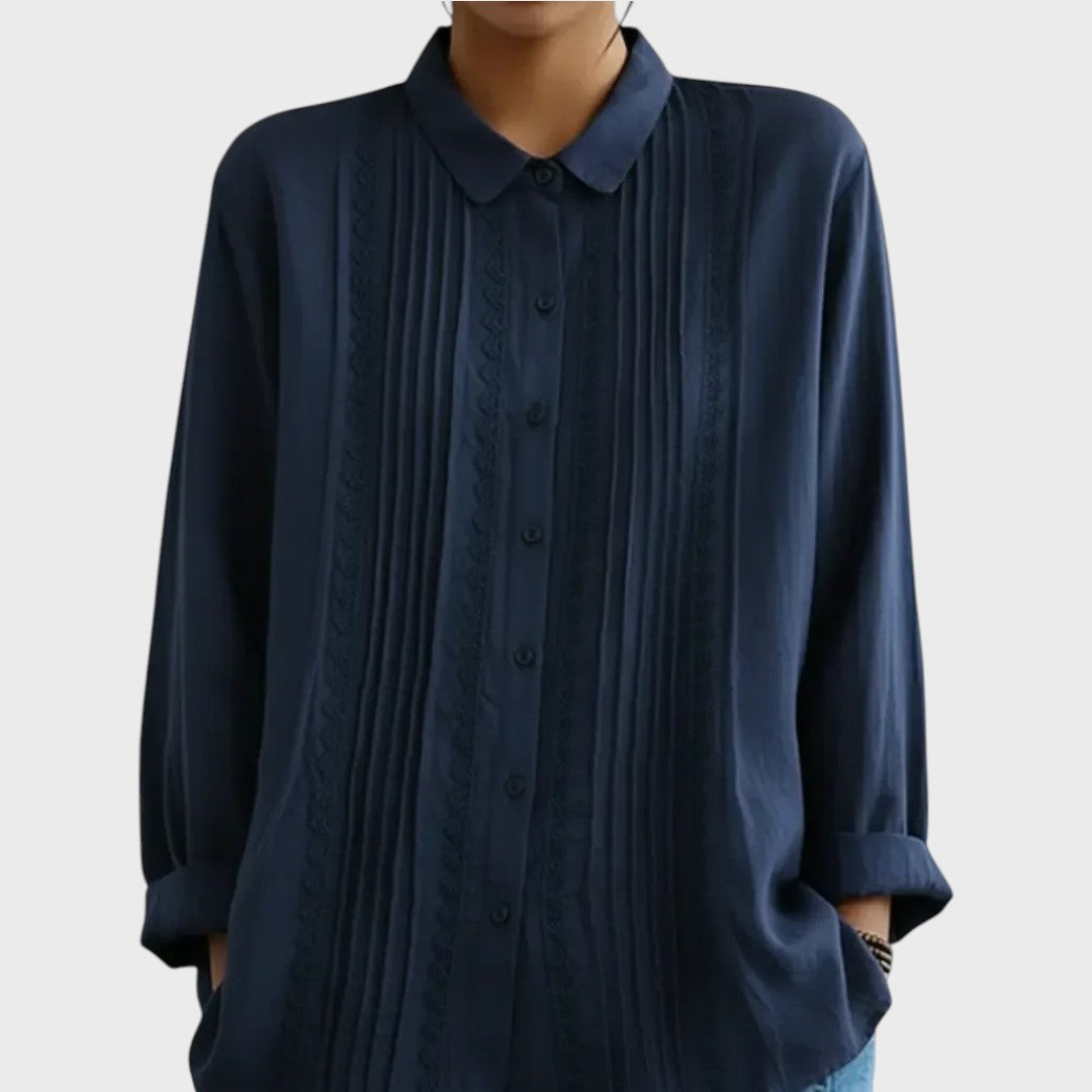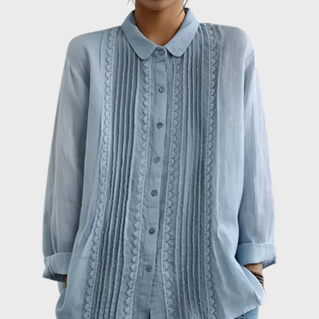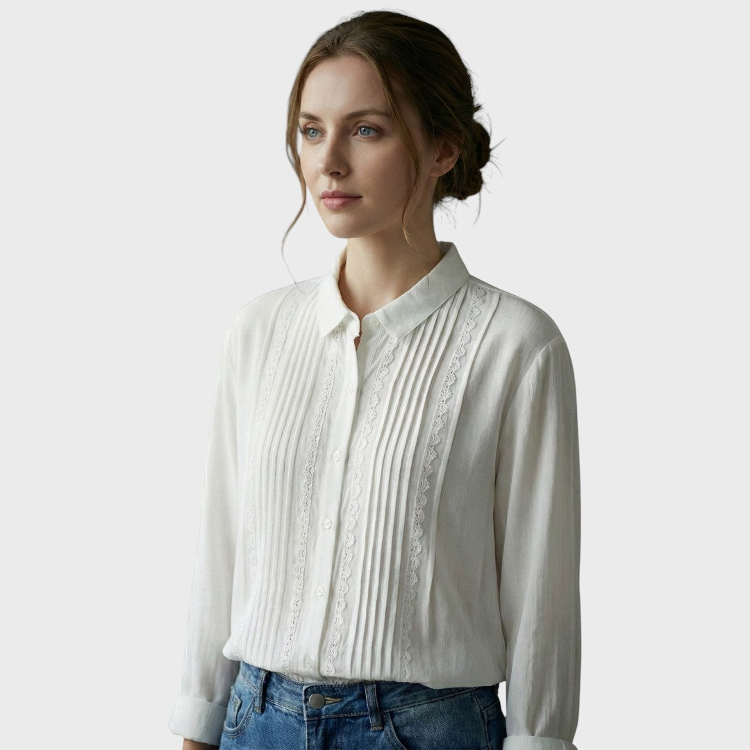 Model Amalie je důkazem, že bílá košile nemusí být nudná. Tento kousek vnáší do šatníku nádech romantiky a vintage stylu. Jemné svislé sklady (sámky) střídané s proužky krajky vytvářejí nádhernou texturu, která působí žensky a propracovaně. Je to ideální volba pro dny, kdy chcete vypadat upraveně, ale zároveň se cítit uvolněně – stačí ji obléknout k džíny a vyrazit.