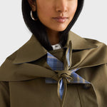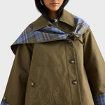 Model Beatrix redefinuje klasický britský styl s nádechem avantgardy. Tento unikátní kabát v olivově zelené barvě zaujme svou velkorysou, áčkovou siluetou, která připomíná pelerínu. Hlavním designovým prvkem je kontrastní kostkovaná podšívka v modrých tónech, která vykukuje na širokých manžetách a límci, čímž dodává celku dynamický a sofistikovaný vzhled.