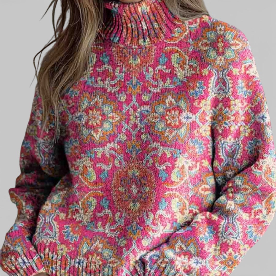 Svetr Eline je ideální volbou pro ženy, které chtějí spojit výrazný elegantní vzhled s maximálním pohodlím. Měkký materiál je příjemný na dotek, zatímco nadčasový střih a dekorativní vzor dodávají outfitu osobitý charakter. Skvělý kousek pro každodenní nošení i stylové kombinace do města.
