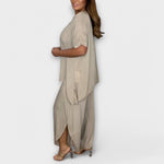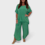 Objevte naši pohodlnou a uvolněnou dvoudílnou soupravu, která kombinuje jednoduchou eleganci s maximálním pohodlím. Ideální pro každodenní nošení, tento komplet spojuje volný top s pohodlnými dlouhými kalhotami – ideální na jaro, léto a podzim.