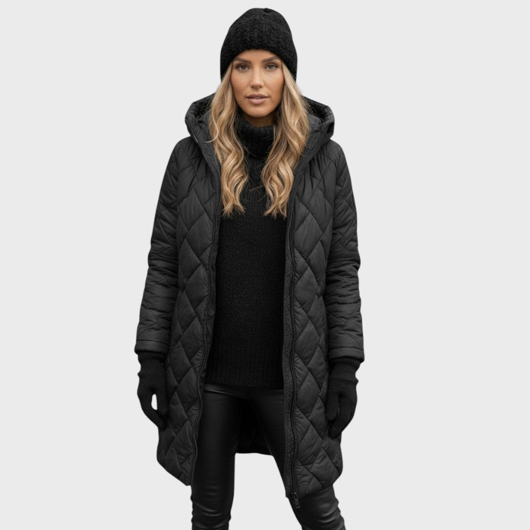 Stylový detail: Moderní geometrické prošívání dodává kabátu luxusní vzhled.